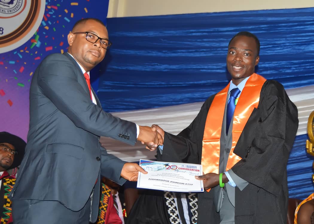 Confidence Lumor, Branch Head of Zenith Bank Ho Branch making a presentation on behalf of the Bank to Mr. Ahiamadzor Joshua Atsu for emerging Best Graduating Student of the Faculty of Applied Sciences and Technology with a graduating CGPA of 4.70.